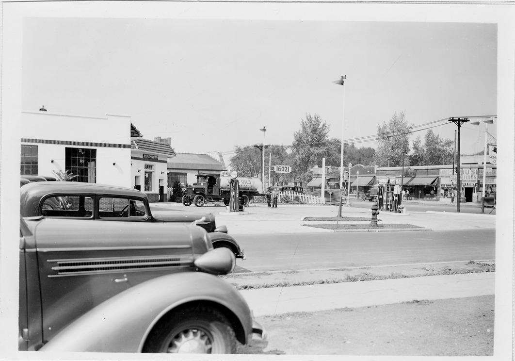 Side view of Mobilgas station with tile roof and three service bays located at Woodward and Pilgrim in Highland Park, Michigan. Four gas pumps in front of station; sign on building: "White Star Division." Two men pose next to oil truck parked on lot. Automobiles in foreground.