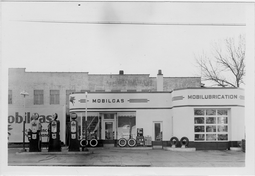 View of Mobilgas station with one service bay located at Saginaw and Maple in Holly, Michigan. Three gas pumps in front of station; signs on building: "Mobilgas, Mobilubrication." Several tires displayed in front of station; partial view of Mobilgas billboard in background.