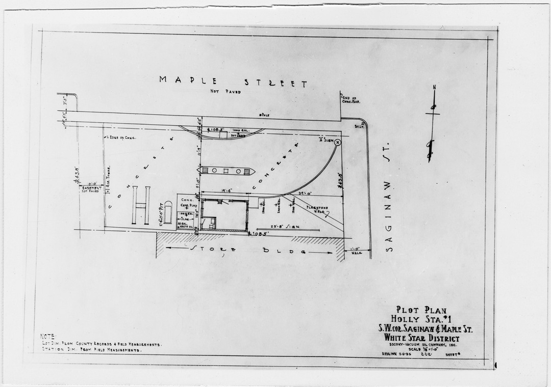Plot plan for gas station number 1 located in Holly, Michigan. Printed on front: 'Plot plan, Holly Sta. #1. S.W. cor. Saginaw & Maple St. White Star District. Socony Vacuum Oil Company, Inc. Scale 1/8"=1'-0". Redrawn 2-6-36. Note: Lot dim. from county records & field measurements, station dim. from field measurements.'