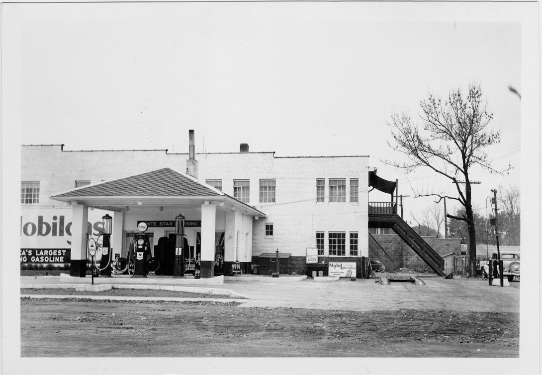 View of Mobilgas station with hipped roof located at Saginaw and Maple in Holly, Michigan. Three gas pumps in front of station; sign over entrance: "White Star Refining." Partial view of Mobilgas billboard behind station; two-story brick building with staircase in background.