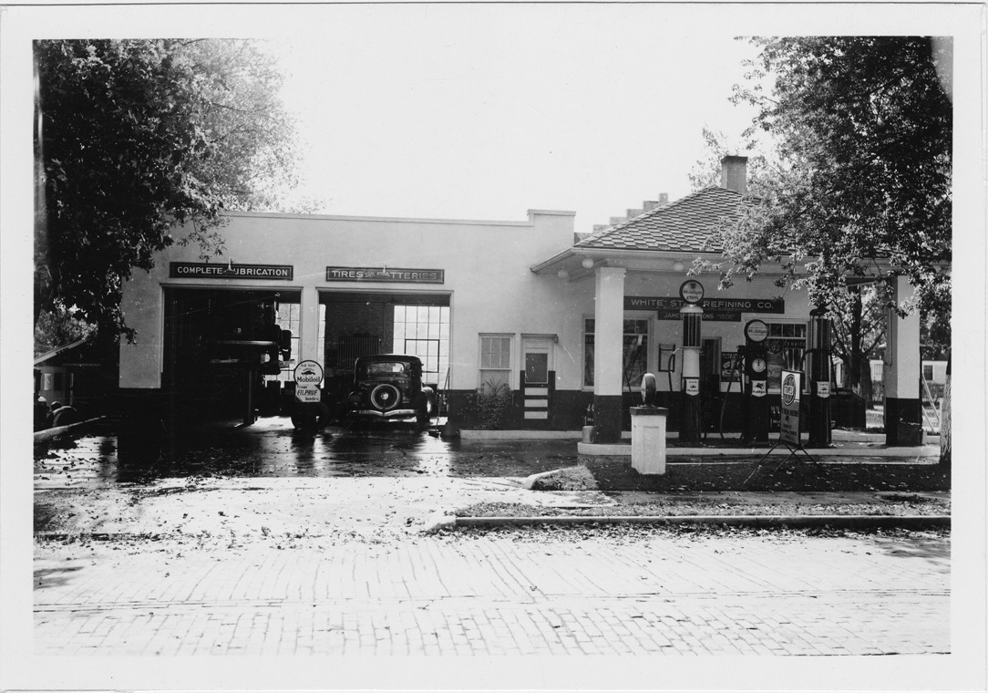 View of Mobilgas station with hipped roof and two service bays located at Main and Amelia in Plymouth, Michigan. Three gas pumps in front of station; sign over entrance: "White Star Refining Co." Signs over bays: "Complete lubrication, tires and batteries." Automobiles parked inside bays; one car is on hoist.
