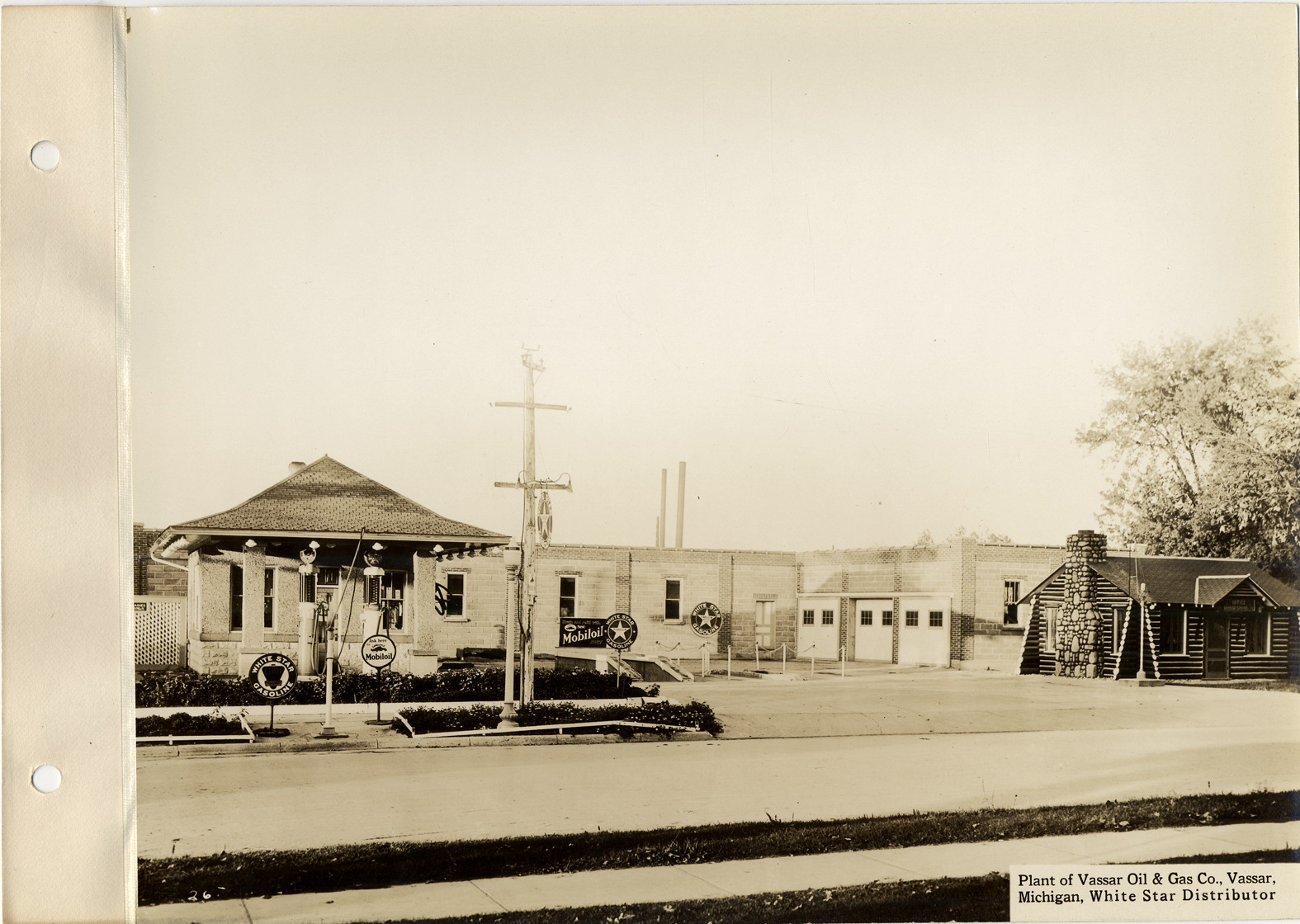 View of gas station with hipped roof located in Vassar, Michigan. Two gas pumps and several White Star gasoline signs in front of station. Log house with stone chimney on right with sign: "Office, Vassar Gas Co." One-story brick factory building behind station. Printed on front: "Plant of Vassar Oil & Gas Co., Vassar, Michigan, White Star distributor."