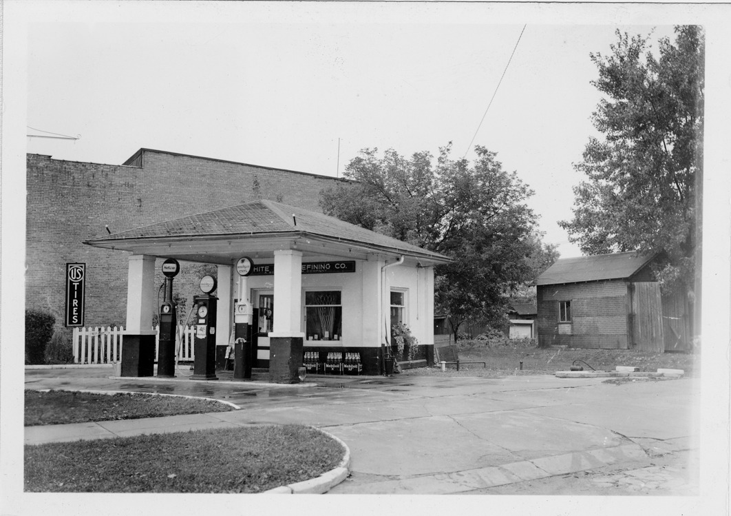 Front and side view of Mobilgas station with hipped roof located at Grand River and Main in Webberville, Michigan. Three gas pumps in front of station; sign over entrance: "White Star Refining Co." Brick building with US Tires sign in background; front-gabled shed or garage with simulated brick siding on right.