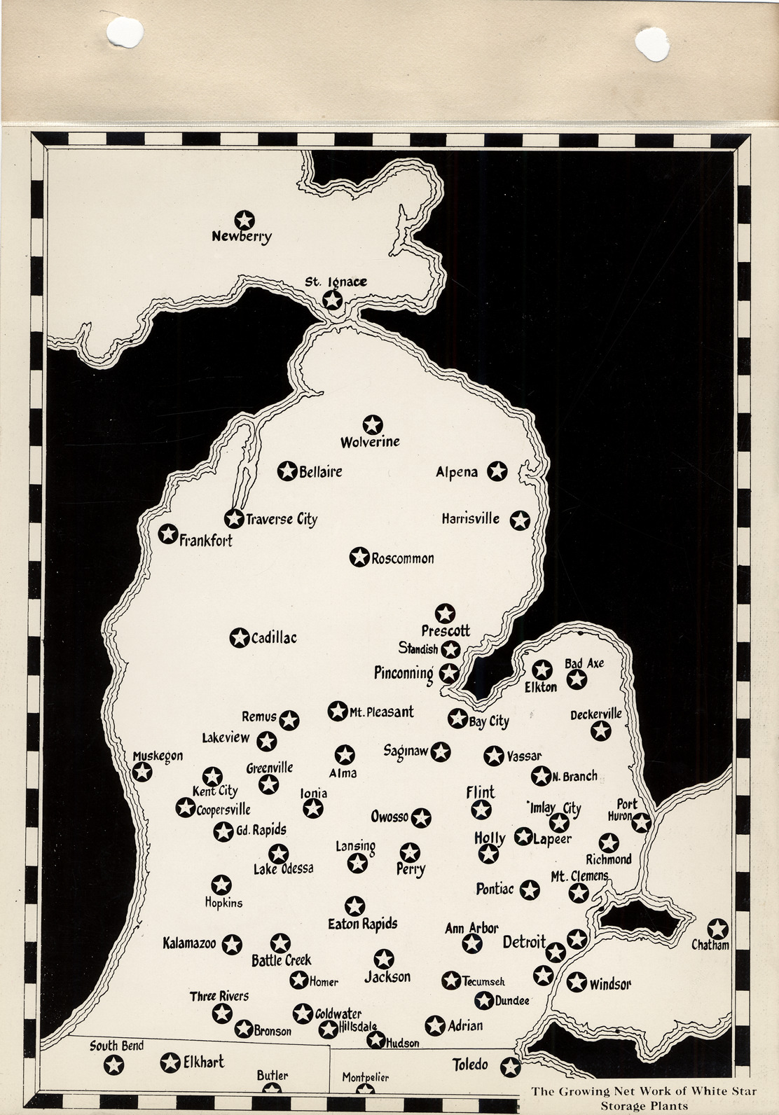 Favorite this☆ Map of White Star Refining Co. storage plants Description: Map showing locations of White Star Refining Co. storage plants in Michigan, northern Indiana, northern Ohio and Ontario, Canada. Printed on front: "The growing net work of White Star storage plants." Details Resource ID: na000370 Creator: White Star Refining Co. Subject: White Star Refining Co. Petroleum storage--Michigan Petroleum industry and trade--Michigan Michigan--Maps Photographic prints Date Issued: Unknown year Format: 1 photographic print mounted on fabric ; image 9.5 x 7.5 in. Member of: Burton Historical Collection Filing Location: MS/White Star Refining Co., Box 2 Rights: Physical rights are retained by DPL. Copyright is retained in accordance with U.S. copyright laws.