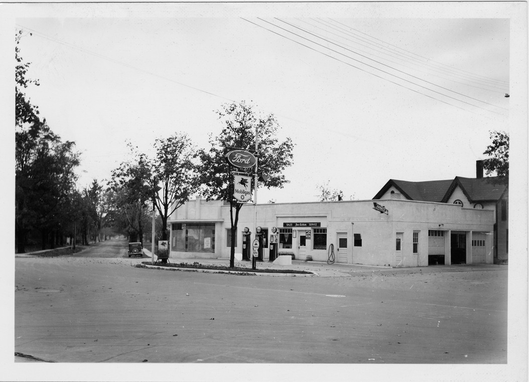 View from across intersection of Mobilgas station with three service bays and Ford dealership located at Washington and Dennison in Oxford, Michigan. Three gas pumps in front of station; sign over entrance: "Joe Achten, sales, service." Mobilgas sign with flying horse symbol and Ford sign in front of station.