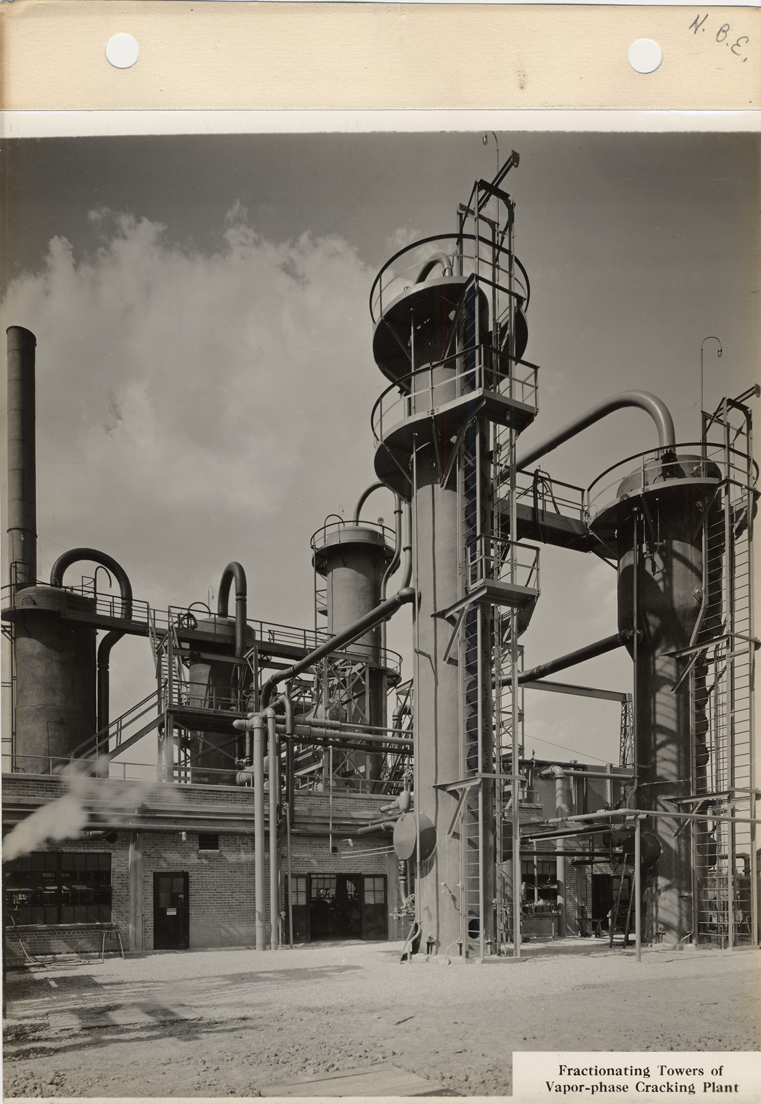 View of cracking plant at Wood River Refinery in Wood River, Illinois. Printed on front: "Fractioning towers of vapor-phase cracking plant."