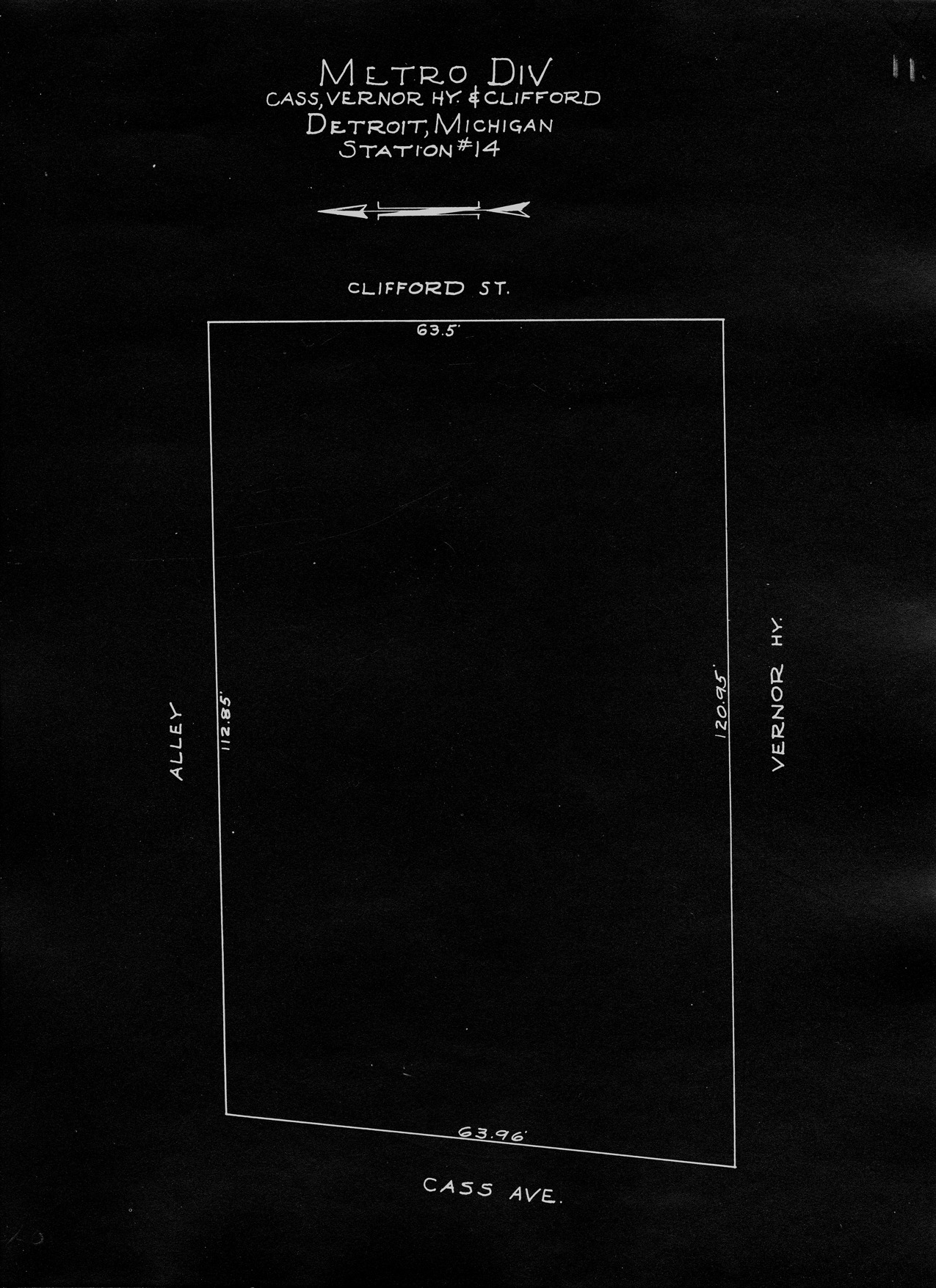 Plot plan for station number 14 located in Detroit, Michigan. Recorded on blueprint: "Metro Div., Cass, Vernor Hy. & Clifford, Detroit, Michigan, station #14." Handwritten on front: "11."