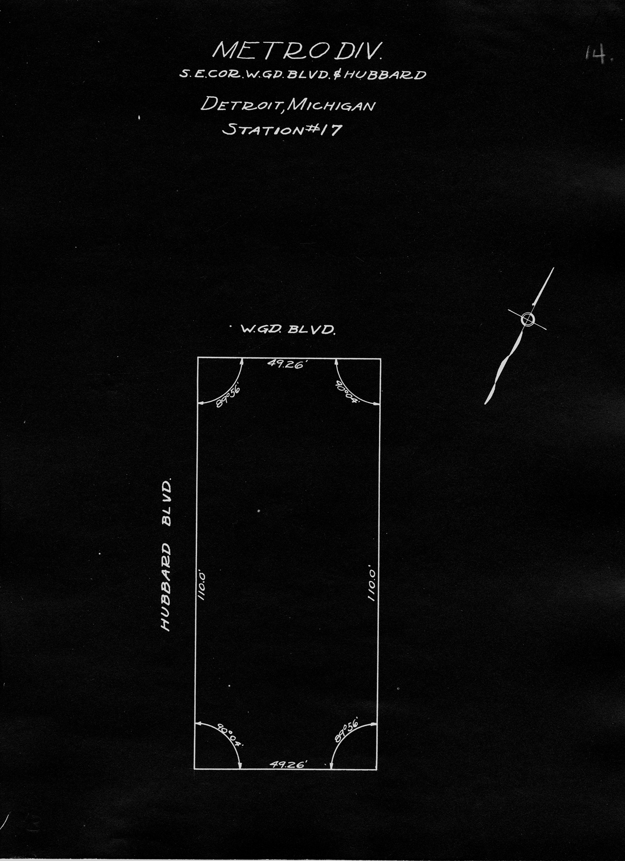 Plot plan for station number 17 located in Detroit, Michigan. Recorded on blueprint: "Metro Div., S.E. cor. of W. Gd. Blvd. & Hubbard, Detroit, Michigan, station #17." Handwritten on front: "14."