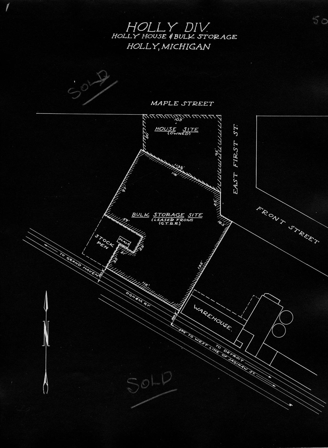 Plot plan for Holly House and bulk storage located in Holly, Michigan. Recorded on blueprint: "Holly Div., Holly house & bulk storage, Holly, Michigan." Handwritten on front: "50."