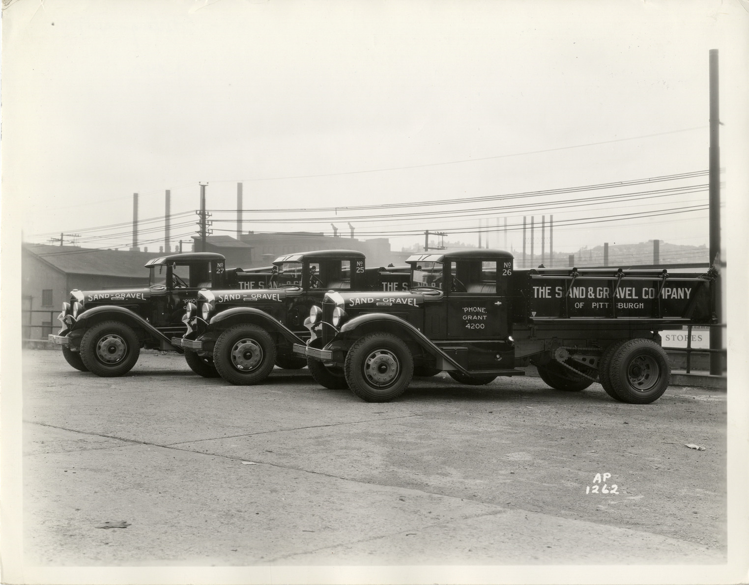 Favorite this☆ Sterling trucks, Sand & Gravel Company of Pittsburgh Description: View of three Sterling trucks, Model FC100, owned by the Sand & Gravel Company of Pittsburgh. Typed on back: "Sterling Model FC100." Handwritten on back: "MT--Sterling--ca. 1930." Details Resource ID: na000487 Subject: Sterling trucks Sand and gravel industry--Pennsylvania--Pittsburgh Photographic prints Date Issued: 1930 (year approximate) Format: 1 photographic print ; 8 x 10.25 in. Member of: National Automotive History Collection Filing Location: Motor trucks--Sterling Rights: Physical rights are retained by DPL. Copyright is retained in accordance with U.S. copyright laws.
