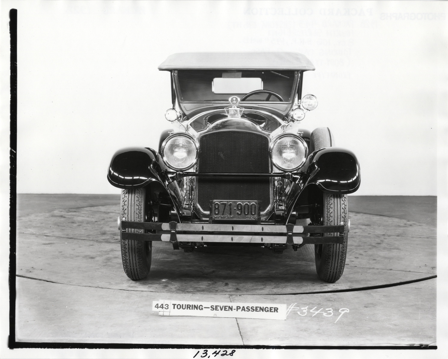 Front view of 1928 Packard 443 Custom Eight car. Sign in front of car reads: "443 Touring, seven-passenger." Handwritten on back: "1928 Packard 443 (Custom Eight), Fourth Series, 8 cy., 106 b.h.p., 143" whb., touring car, 7-pass. (body type #310), prototype, late 1926."