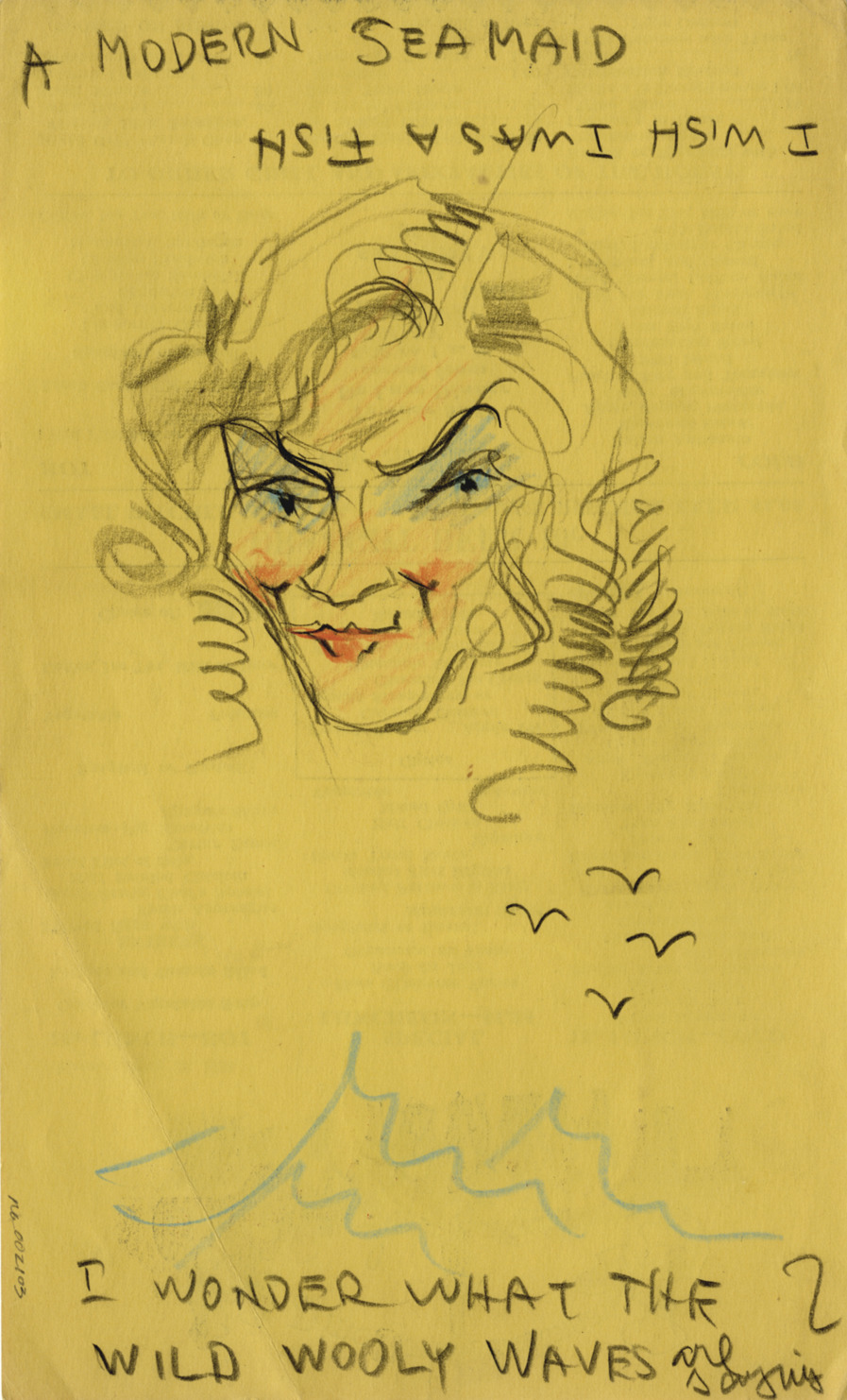 Favorite this☆ Caricature of Aloha Baker Description: Caricature of Aloha Baker. Handwritten on front: "A modern seamaid, I wish I was a fish, I wonder what the wild wooly waves are saying?" Details Resource ID: na002103 Subject: Baker, Aloha W., 1908-1996--Caricatures and cartoons Baker, Aloha W., 1908-1996--Archives Watercolor painting Date Issued: Unknown year Format: 1 sheet : col. ; 10 x 6 in. Member of: National Automotive History Collection Filing Location: MS33/Aloha Baker collection, Box 5, Folder 18-Wanderwells: Aloha, Cartoons & Drawings, 1923-28 Rights: Physical rights are retained by DPL. Copyright is retained in accordance with U.S. copyright laws.