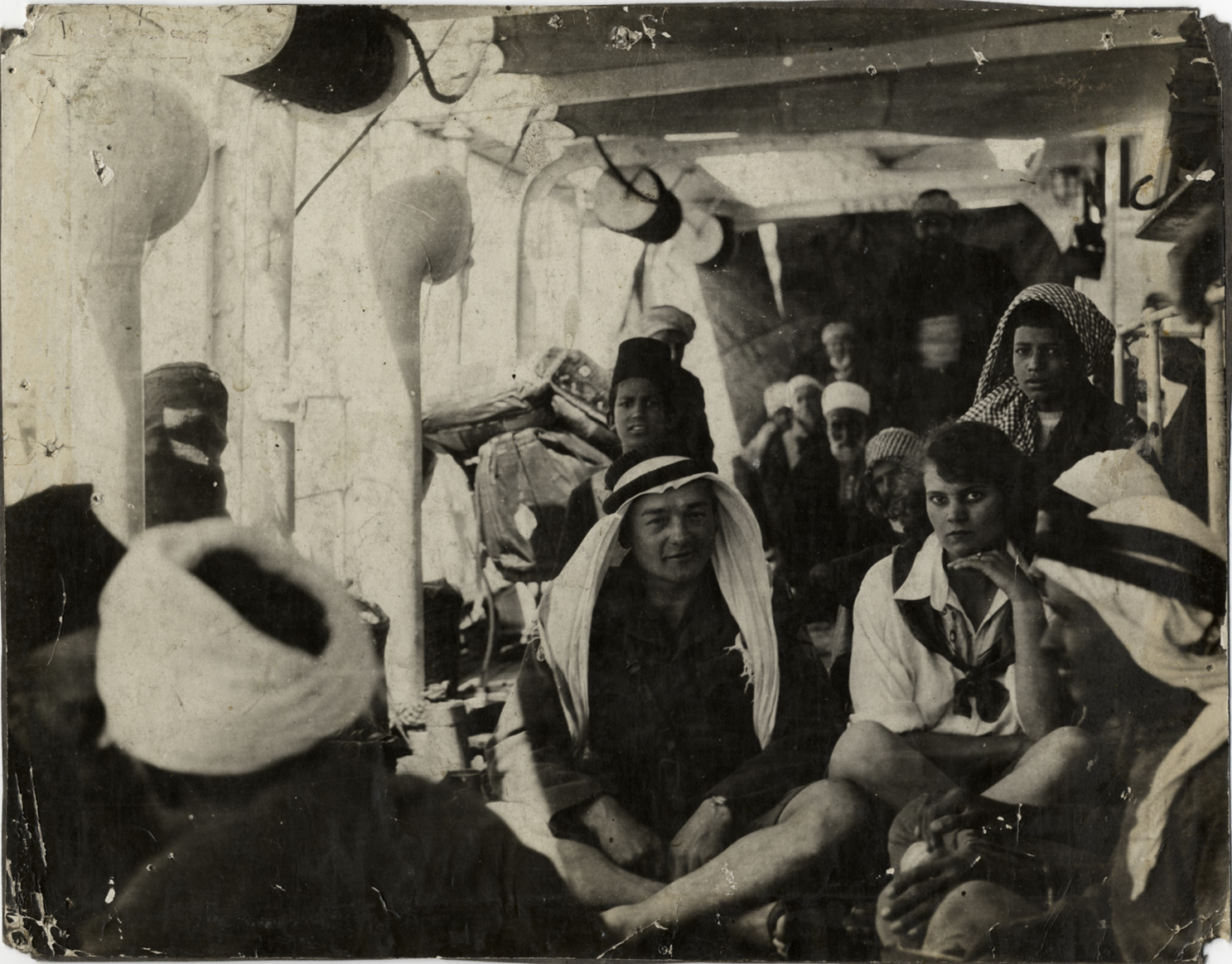 Favorite this☆ Aloha Baker and Walter Wanderwell on board ship Description: View of Aloha Baker and Walter Wanderwell on board ship with group of men. Details Resource ID: na002206 Subject: Wanderwell, Walter, 1897-1932 Baker, Aloha W., 1908-1996 Men--Egypt Baker, Aloha W., 1908-1996--Archives Photographic prints Date Issued: 1924 Format: 1 photographic print ; 7.75 x 10 in. Member of: National Automotive History Collection Filing Location: MS33/Aloha Baker collection, Box 6, Folder 6, Africa, Photographs, East Africa (Egypt), 1924 Rights: Physical rights are retained by DPL. Copyright is retained in accordance with U.S. copyright laws.