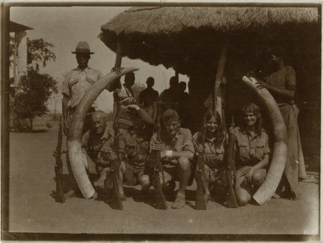 Favorite this☆ Aloha Baker, Walter Wanderwell and Meg Hall in Mozambique Description: View of Aloha Baker, Walter Wanderwell, Meg Hall and hunters posing with African man and woman holding tusks. Shelter with thatched roof in background. Details Resource ID: na002216 Subject: Wanderwell, Walter, 1897-1932 Baker, Aloha W., 1908-1996 Hall, Meg Tusks--Mozambique Baker, Aloha W., 1908-1996--Archives Photographic prints Date Issued: 1927 Format: 1 photographic print ; 3.25 x 4.25 in. Member of: National Automotive History Collection Filing Location: MS33/Aloha Baker collection, Box 6, Folder 8, Africa, Photographs, East Africa (Mozambique), 1927 Rights: Physical rights are retained by DPL. Copyright is retained in accordance with U.S. copyright laws.