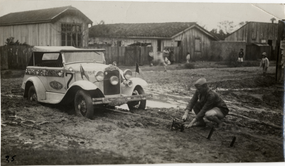 View of Walter Wanderwell, kneeling on muddy ground, using winch on car no. 2. Wooden frame houses in background. Handwritten on back: "In mud using the most indispensable piece of equipment on the Buenos Aires Detroit expedition, a very light weight winch. A fine cable, three steel pegs & chains. Extracted Model A from many an impassable, impossible impasse, hills, gulleys, mud, streams."