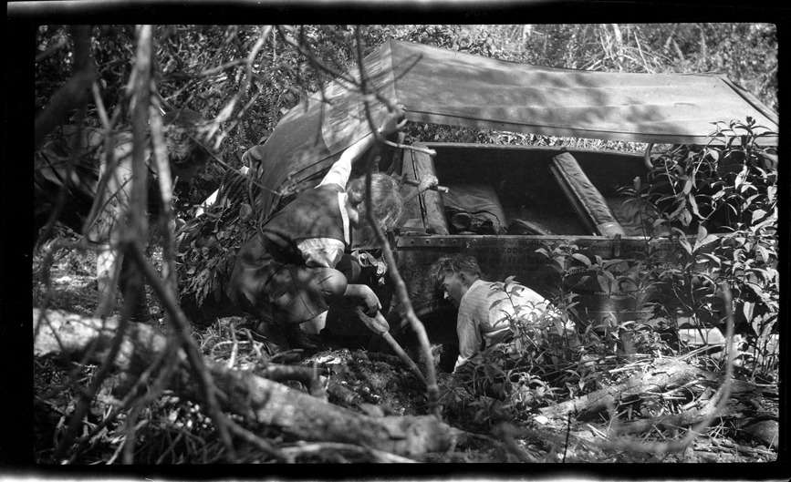 Members of Wanderwell expedition trying to dislodge automobile