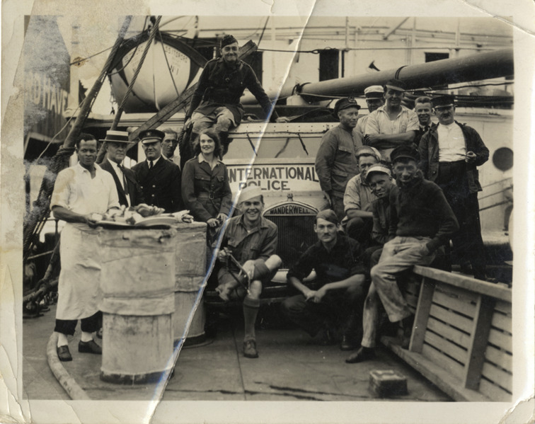 View of Aloha Baker and Walter Wanderwell posing with sailors on ship. Wanderwell international police vehicle in background. Handwritten on back: "Aboard the Argentine ship we crewed from Florida to Montreal, Canada, 1926."