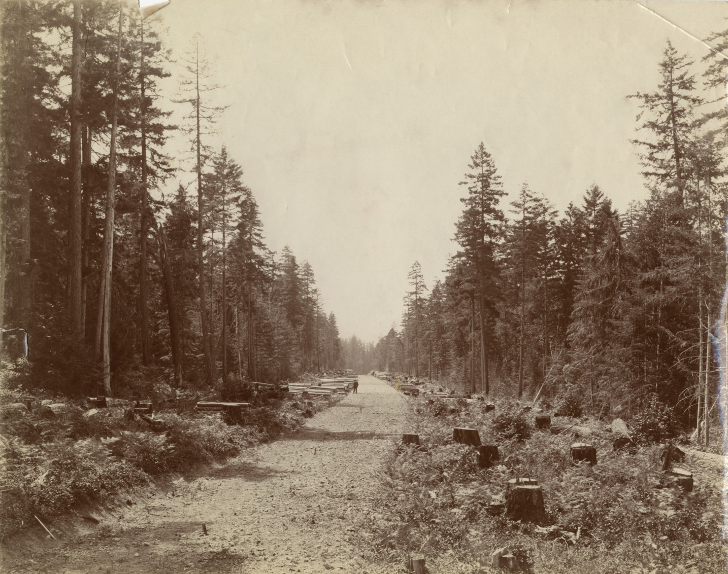 Favorite this☆ Railroad right of way in Canada Description: View of man standing on dirt road in forest; tree stumps and logs on both sides of road. Handwritten on back: "Railway right of way near [undecipherable], about 1912." Details Resource ID: na002281 Subject: Railroads--Right of way--Canada Dirt roads--Canada Tree felling--Canada Baker, Aloha W., 1908-1996--Archives Photographic prints Date Issued: 1912 (year approximate) Format: 1 photographic print ; 7.5 x 9.5 in. Member of: National Automotive History Collection Filing Location: MS33/Aloha Baker collection, Box 7, Folder 5, America: North, Photographs, Canada, 1912-26 Rights: Physical rights are retained by DPL. Copyright is retained in accordance with U.S. copyright laws.