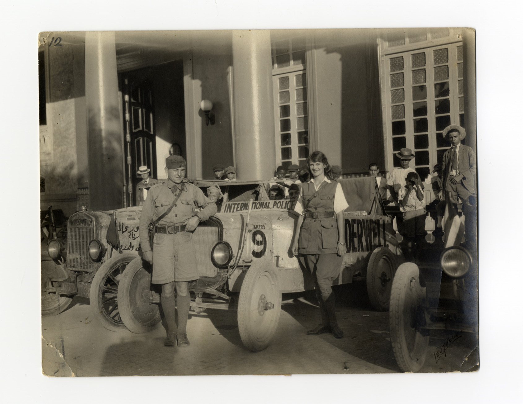 View of Aloha Baker and Walter Wanderwell posing with international police expedition vehicle in Cuba. Onlookers stand behind automobile. Handwritten on front: "Leuthold." Handwritten on back: "Cuba, the stripped down cars, no fenders, no visible door, impatience in the [undecipherable], no running boards." Stamped on back: "Para reproducciones de esta fotografia, pidase el no. Wanderwell #4 a C. Leuthold, fotografe. Industria 35. E. Cardenas, Cuba."