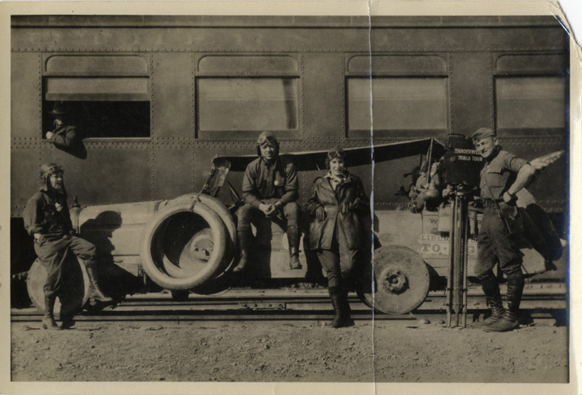View of Walter Wanderwell, Nell Wanderwell, Wanderwell expedition crew and car no. 1 in front of railway car in Mexico. Wanderwell holds movie camera. Handwritten on back: "1919, Mex., Sonora, Wanderwell #1, 1919 draped for press (crew) Cap. W., Nell W., mechanic."