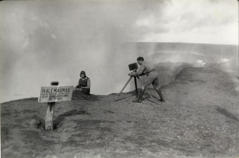 View of Walter Wanderwell filming Aloha Baker at Halemaumau Crater in Hawaii. Signed posted in foreground: "Halemaumau, house of everlasting fire, 3500 wide, 3000 long, 1500 ft. deep." Typed on back: "On the brink of disaster. A grimacing Aloha poses on the edge of the steaming Halemaumau crater in Hawaii while Capt. Wanderwell records the moment on film. A similar situation earlier had caused Aloha to step dangerously close ... active volcano." Handwritten on back: "Almost walk off the edge of the live volcano while staring toward the movie camera."
