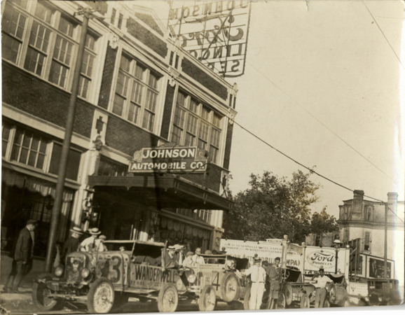 View of Wanderwell cars no. 3 and no. 4 parked in front of Johnson Automobile Co. in St. Louis, Missouri. Onlookers gather on sidewalk. Handwritten on back: "Self in no. 4, July, 1925, St. Louis, Mis."