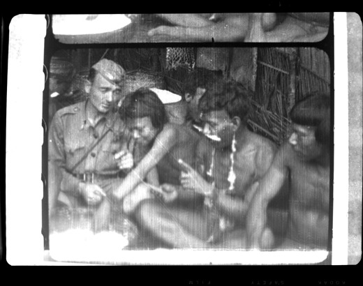 View of Walter Wanderwell and Bororo Indians seated in front of bowl of food. Handwritten on sleeve: "Brazil, over Mato Groso [sic]. Cap & Chief Tabore & 2 Bororos looking over something in search of Fawcett, passage north. South America, Brazil, Mato Grosso, 1930-31."