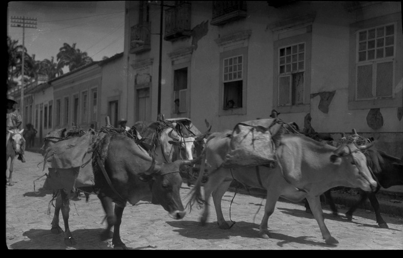 Favorite this☆ Oxen herded through street in Corumba, Brazil Description: View of team of oxen, draped with saddlebags, being herded through street in Corumba, Brazil. Handwritten on sleeve: "Brazil, midway between Rio & Esparanza [sic], Corumba. Rio to Corumba, South America, Brazil, 1930-31." Details Resource ID: na002349 Subject: Oxen Wanderwell, Walter, 1897-1932--Travel--Brazil--Corumba Streets--Brazil--Corumba Baker, Aloha W., 1908-1996--Archives Photography--Negatives Date Issued: 1930 to 1931 Format: 1 negative ; 3.5 x 5.25 in. Member of: National Automotive History Collection Filing Location: MS33/Aloha Baker collection, Box 7, Folder 12, America: South, Negative sleeves, Brazil, 1930-31 Negative Number: SAM-726 Rights: Physical rights are retained by DPL. Copyright is retained in accordance with U.S. copyright laws.