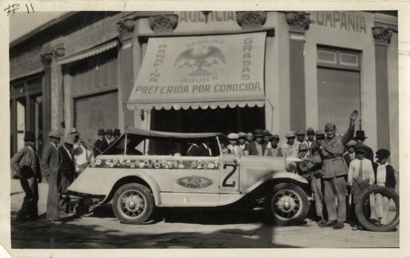 View of Walter Wanderwell posing with car no. 2 in front of building in Buenos Aires, Argentina. Automobile is decorated with car badges and "Work Around the World Educational Club" logo. Awning in background reads: "Gasolina Aguila, preferida por conocida." Onlookers gather behind car. Handwritten on back: "The brand new Model A 1930 with Briggs built factory rear slope from the Captain [undecipherable] at Chicago air races parade & [undecipherable]."