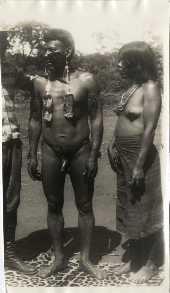 View of Bororo Indian man and woman standing with member of Wanderwell expedition.