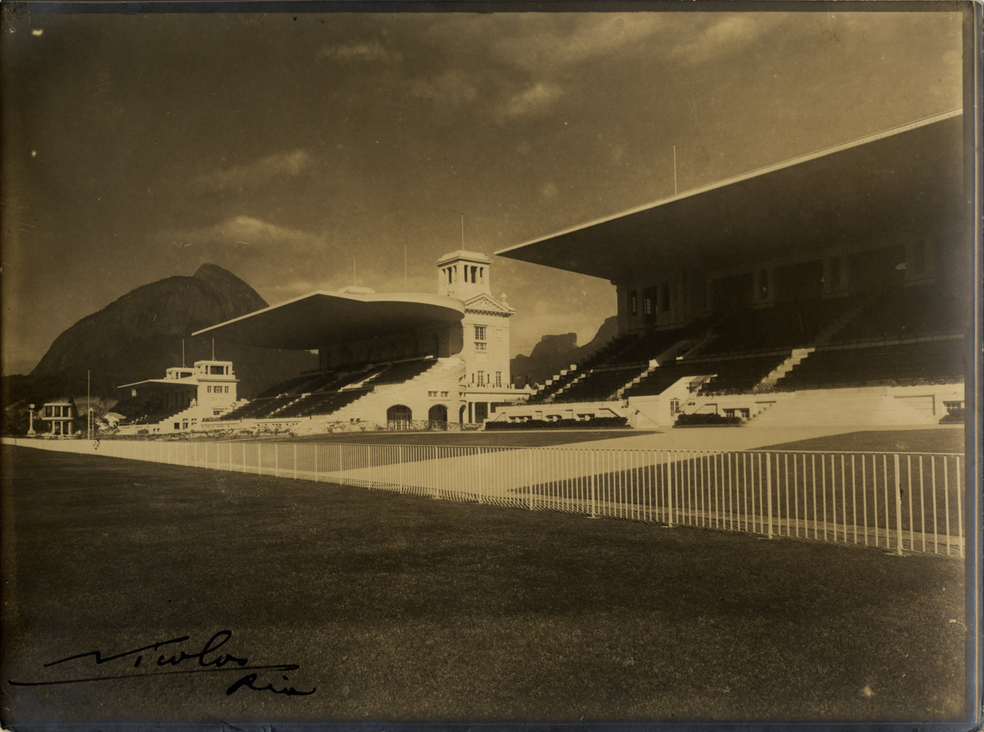View of Hipodromo de Gavea racetrack in Rio de Janeiro, Brazil. Handwritten on back: "Hipodrome."