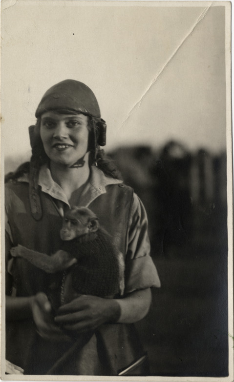 Favorite this☆ Aloha Baker holding monkey Description: View of Aloha Baker holding monkey in China. Handwritten on back: "Kim & self snapped at Horbin Races, n'est-ce pas qu'il est joli?" Details Resource ID: na002462 Subject: Baker, Aloha W., 1908-1996 Monkeys--China Baker, Aloha W., 1908-1996--Archives Photographic prints Postcards Date Issued: 1924 Format: 1 postcard ; 5.25 x 3.25 in. Member of: National Automotive History Collection Filing Location: MS33/Aloha Baker collection, Box 8, Folder 5, Asia, Photographs, China, 1924 Rights: Physical rights are retained by DPL. Copyright is retained in accordance with U.S. copyright laws.