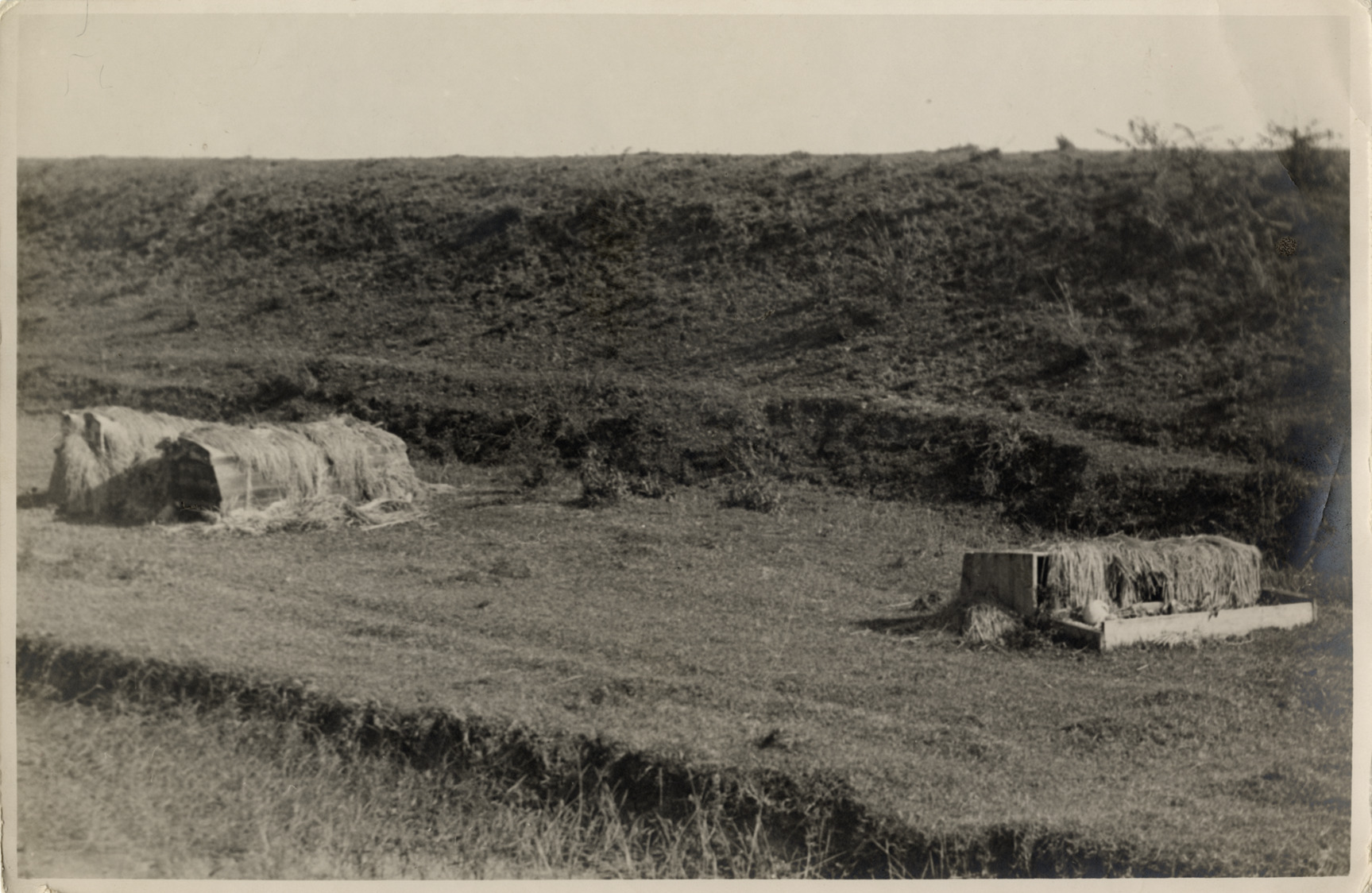 View of several wooden coffins covered with straw in field in China. Handwritten on back: "[undecipherable] burial grounds high & dry but not when the floods came. Skeletons drying out in the sun, our trail on the upper [undecipherable], 1924, enroute to [undecipherable] China."