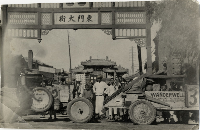 Favorite this☆ Wanderwell automobiles in Tianjin, China Description: View of cars no. 2 and no. 3 parked in front of gate in Tianjin, China. Onlookers stand behind automobiles; building in background. Handwritten on back: "Tientsin? Before the inundation, keeping crowd at bay, our [undecipherable] on right." Details Resource ID: na002477 Subject: Automobiles Gates--China--Tianjin Architecture--China--Tianjin Wanderwell, Walter, 1897-1932--Travel--China--Tianjin Baker, Aloha W., 1908-1996--Archives Photographic prints Date Issued: 1924 Format: 1 photographic print ; 3.5 x 5.5 in. Member of: National Automotive History Collection Filing Location: MS33/Aloha Baker collection, Box 8, Folder 5, Asia, Photographs, China, 1924 Rights: Physical rights are retained by DPL. Copyright is retained in accordance with U.S. copyright laws.