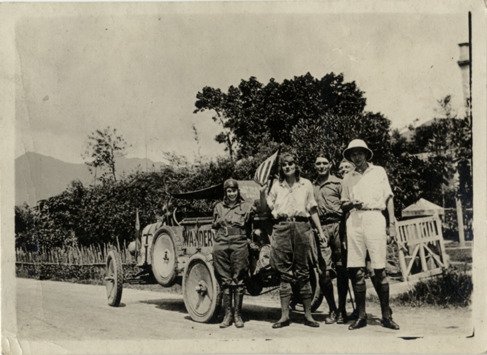 View of Aloha Baker and members of Wanderwell expedition crew posing with car on side of road in China. Handwritten on back: "Somewhere south of Kowloon, ready to flee bandits on the sea."