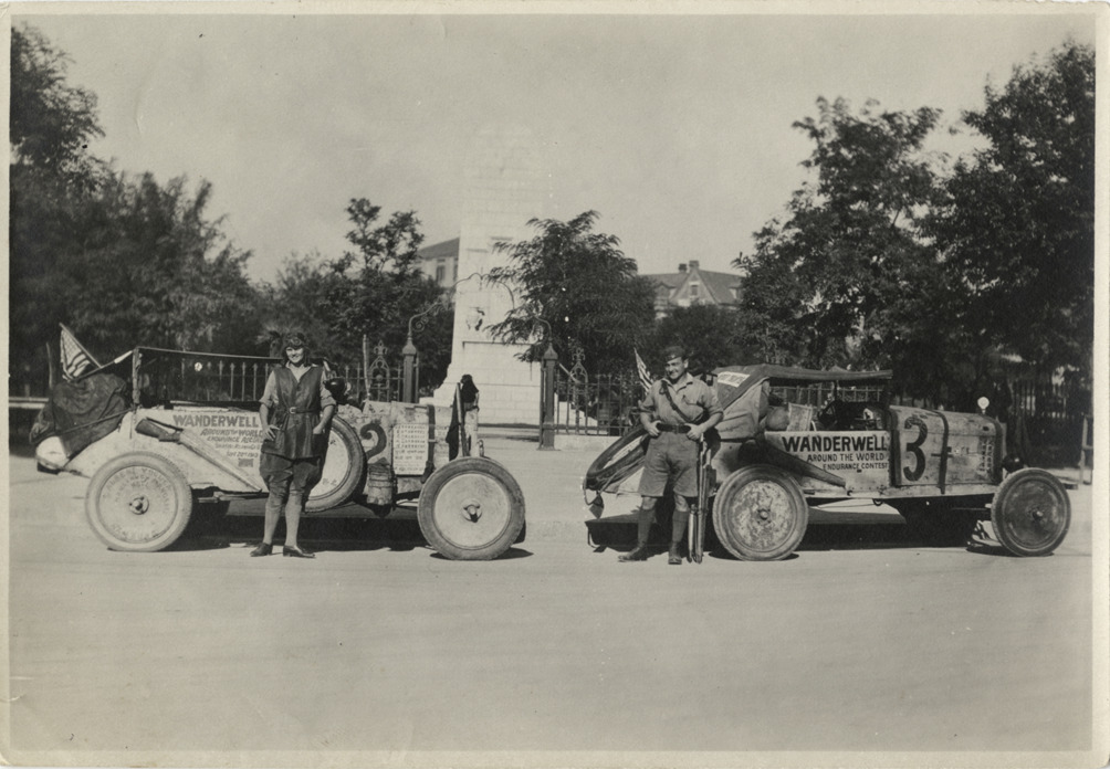 Favorite this☆ Aloha Baker and Walter Wanderwell with automobiles in China Description: View of Aloha Baker and Walter Wanderwell posing with cars no. 2 and no. 3 in front of monument in China. Details Resource ID: na002483 Subject: Baker, Aloha W., 1908-1996 Wanderwell, Walter, 1897-1932 Automobiles Monuments--China Baker, Aloha W., 1908-1996--Archives Photographic prints Date Issued: 1924 Format: 1 photographic print ; 4.75 x 6.75 in. Member of: National Automotive History Collection Filing Location: MS33/Aloha Baker collection, Box 8, Folder 5, Asia, Photographs, China, 1924 Rights: Physical rights are retained by DPL. Copyright is retained in accordance with U.S. copyright laws.