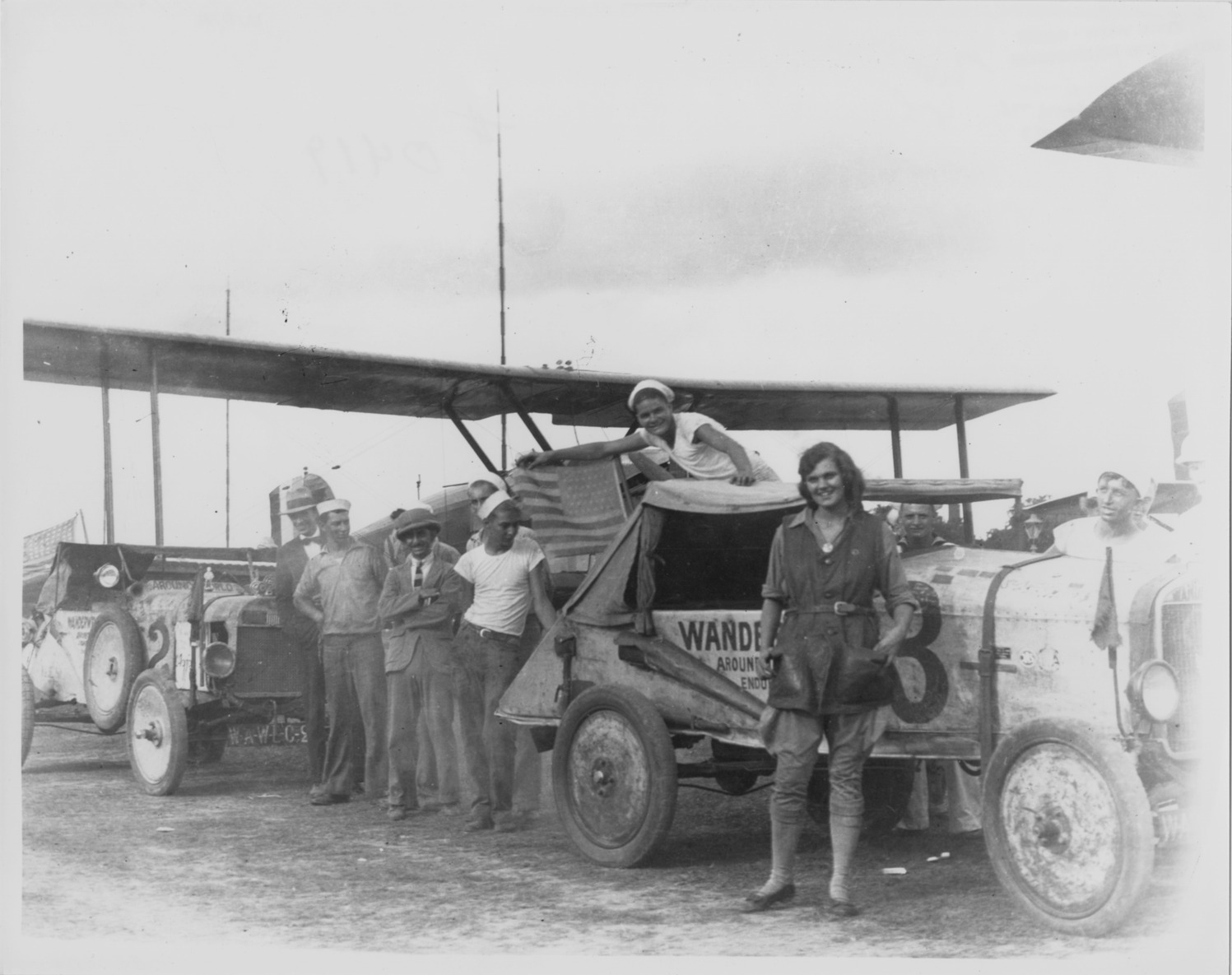 View of Aloha Baker and several men, some wearing sailor hats, posing with Wanderwell cars no. 2 and no. 3 in Calcutta, India. Wings of biplane visible in background. Handwritten on back: "July, 1924."