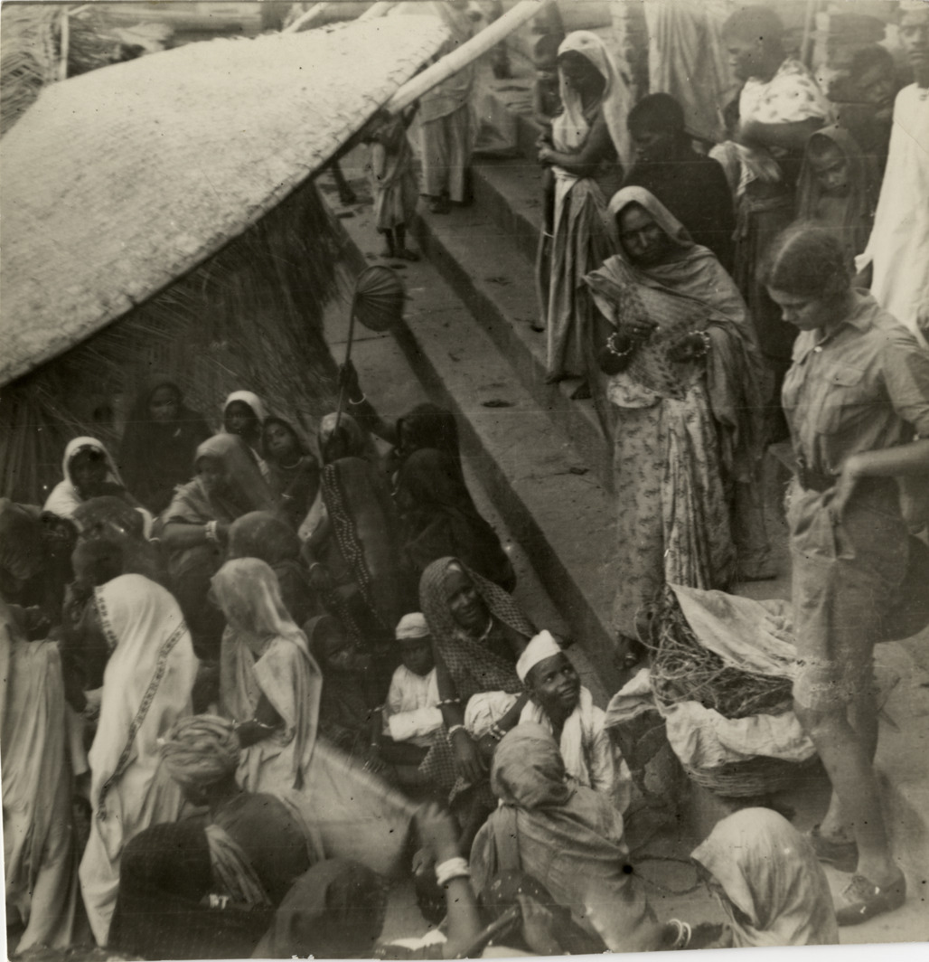View of Aloha Baker among crowd on the bank of the Ganges River in India. Handwritten on back: "On the banks of the Ganges River, central India. The burning ghats and bathing ghats where the dead are cremated on open fires and the worshippers wash away their sins in the same waters below."