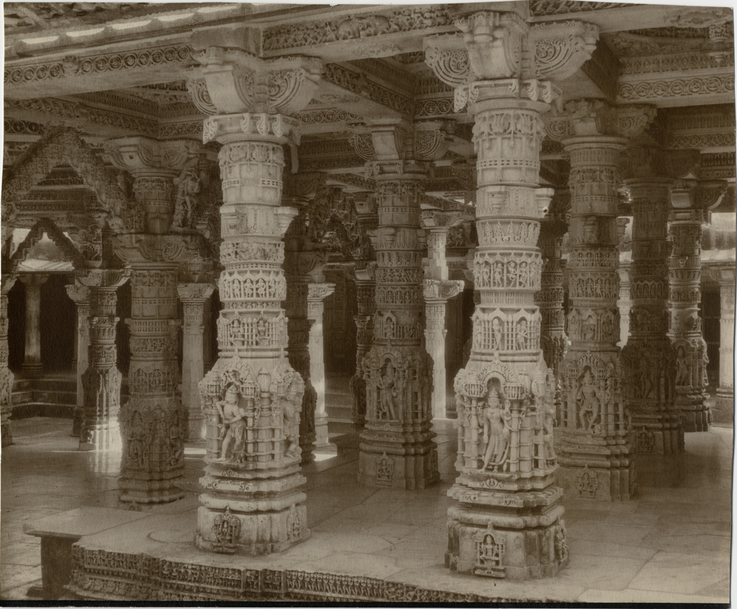 View of columns inside Dilwara Temple at Mount Abu, India. Handwritten on back: "[M]ount Abu, columns of white marble, beautiful carved on [undecipherable] of the [undecipherable] Dilwara Temple."
