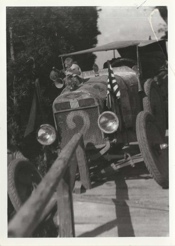 View of Wanderwell car no. 2 on wooden bridge in Japan. Automobile has broken through railing; tire hangs over edge of bridge. Monkey climbs on hood of car. Typed on back: "Japanese mishap, a primitive, narrow wooden bridge on the west coast of Japan, a bit narrow for unit 2, no serious damage occured and the car was quickly lifted back onto the bridge."