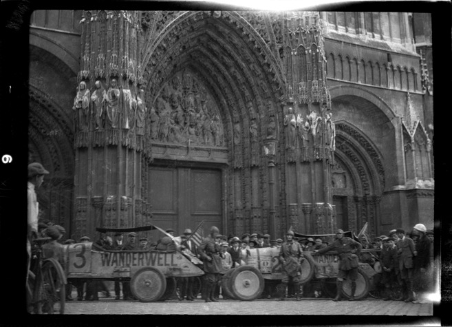 Wanderwell automobiles in front of Rouen Cathedral