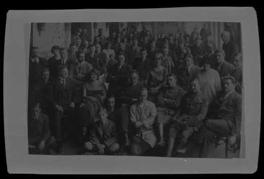 Group portrait of Walter Wanderwell and members of unidentified auto club at reception. Handwritten on sleeve: "WW family portrait? [sic]. Europe, Poland, 1923-24."