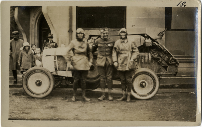 View of Walter Wanderwell and members of expedition crew with car in England. Handwritten on back: "England."