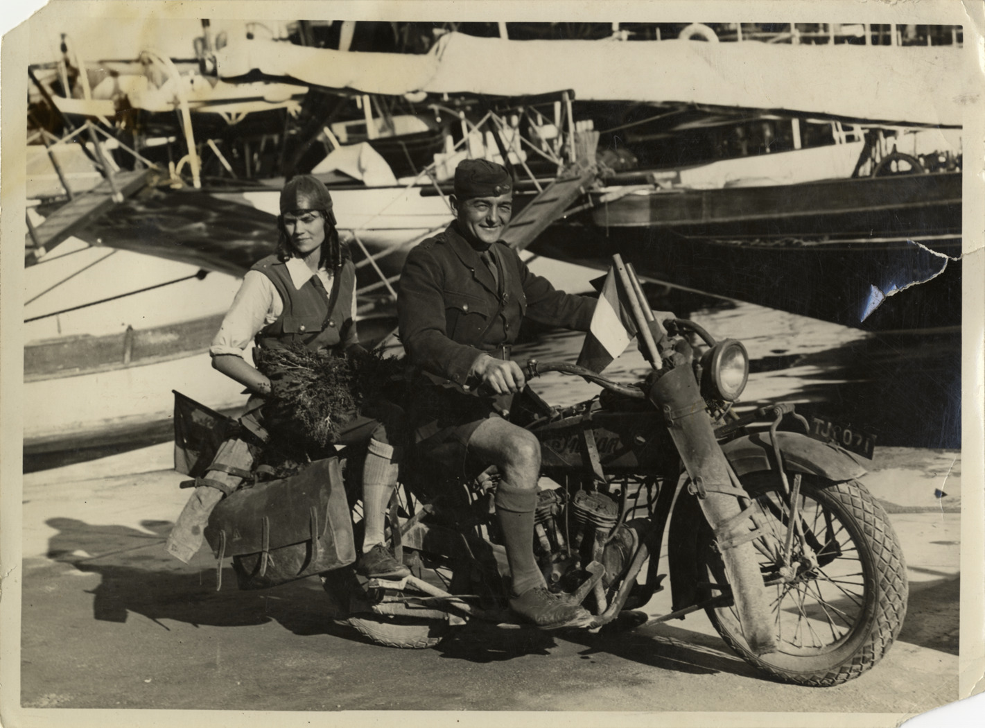 Aloha Baker and Walter Wanderwell on motorcycle in France