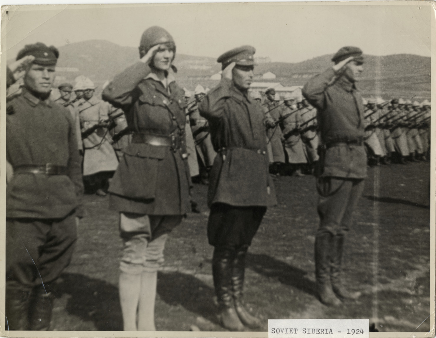 View of Aloha Baker and soldiers saluting in Siberia. Typed on front: "Soviet Siberia, 1924." Handwritten on back: "Siberia, from 'Car & Camera.'"