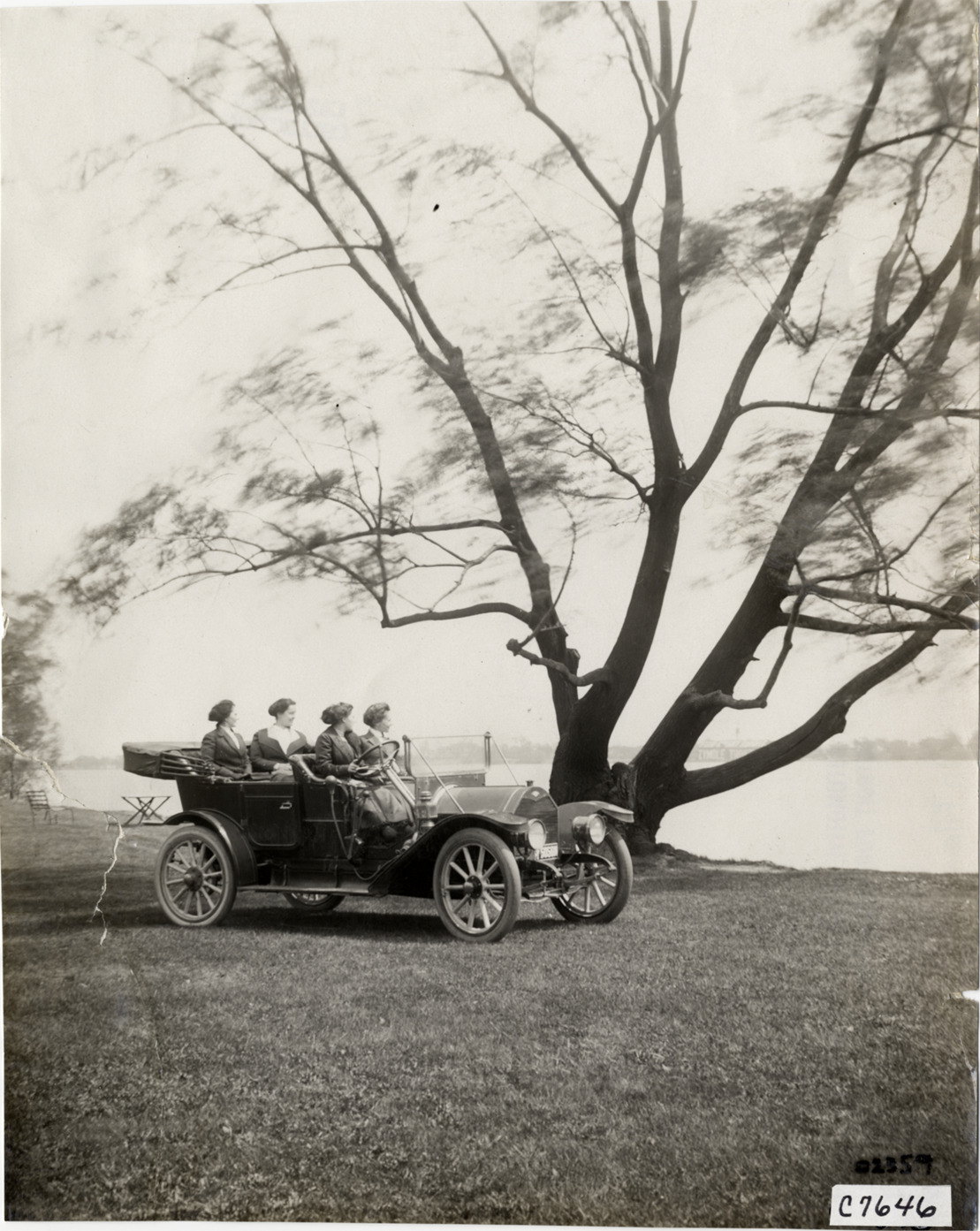 View of four women sitting in 1911 Abbott-Detroit car on Belle Isle. Tree in background. Stamped on back: "Spooner & Wells, Inc., photographers, 1231 Woodward Ave., Detroit, Mich., telephone North 1745." Handwritten on back: "Abbott-Detroit, 1911. Belle Isle, Detroit, Mi."