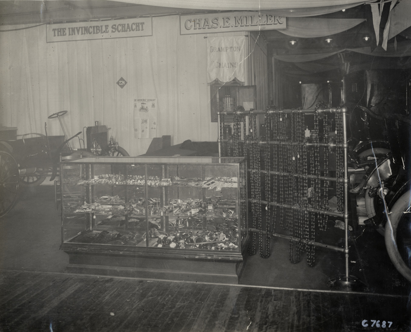 Favorite this☆ Charles E. Miller company display Description: View of display for Charles E. Miller company. Chains draped over rack; glass display case in foreground. Signs in background: "Chas. E. Miller, Brampton chains." Handwritten on back: "Accessories--General, Charles E. Miller Co., 1909." Details Resource ID: na002807 Subject: Chains Automobile supplies industry Display of merchandise Photographic prints Date Issued: 1909 Format: 1 photographic print ; 7.5 x 9.25 in. Member of: National Automotive History Collection Lazarnick Collection Filing Location: Accessories #1 Negative Number: Negative #C7687 Rights: Physical rights are retained by DPL. Copyright is retained in accordance with U.S. copyright laws.