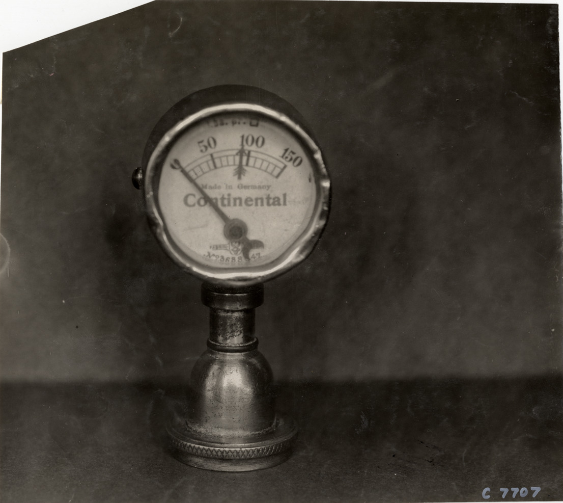 View of Continental pressure gauge. Handwritten on back: "Accessories--Pressure gauge, 1909."