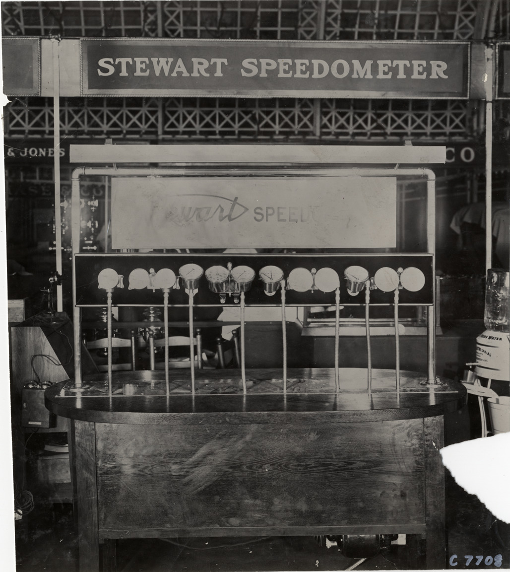 View of display for Stewart & Clark Manufacturing Company speedometers. Signs in background: "Stewart speedometer." Stamped on back: "Spooner & Wells, Inc., photographers, telephones 3472-3473 Columbus, 1931 Broadway, New York." Handwritten on back: "Accessories--Speedometers, Stewart & Clark Mfg. Co., 1909."