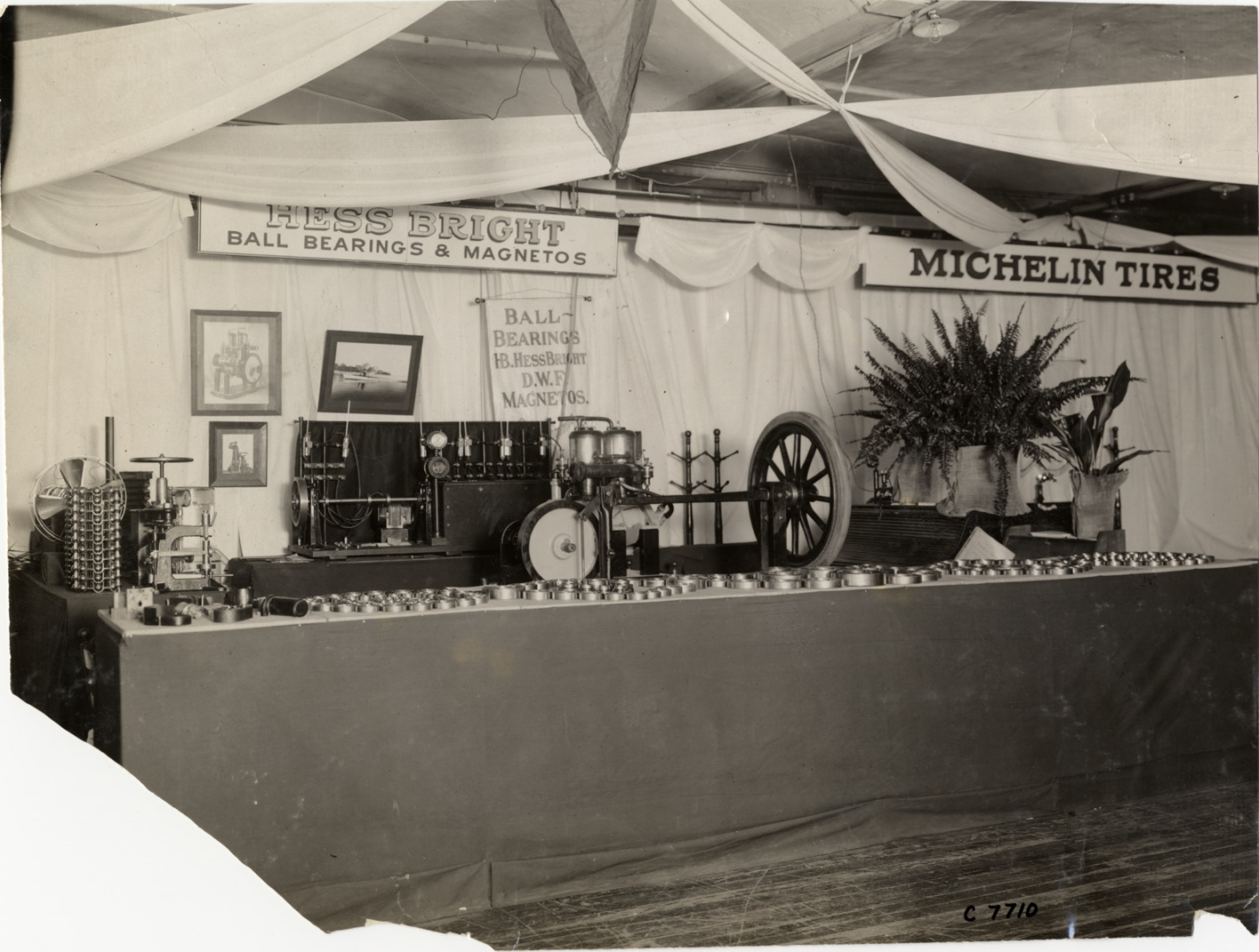 Favorite this☆ Hess Bright Manufacturing Company display Description: View of display for Hess Bright Manufacturing Company ball bearings. Signs in background: "Hess Bright, ball bearings & magnetos; ball bearings, HB. Hess Bright, D.W.F. magnetos; Michelin tires." Stamped on back: "Spooner & Wells, Inc., photographers, telephones 3472-3473 Columbus, 1931 Broadway, New York." Handwritten on back: "Accessories--Electrical, Hess-Bright Mfg. Co., 1909." Details Resource ID: na002830 Creator: Spooner & Wells Subject: Automobile supplies industry Automobiles--Bearings Display of merchandise Photographers--New York (State)--New York Photographic prints Date Issued: 1909 Format: 1 photographic print ; 7.25 x 9.5 in. Member of: National Automotive History Collection Lazarnick Collection Filing Location: Accessories #2 Negative Number: Negative #C7710 Rights: Physical rights are retained by DPL. Copyright is retained in accordance with U.S. copyright laws.